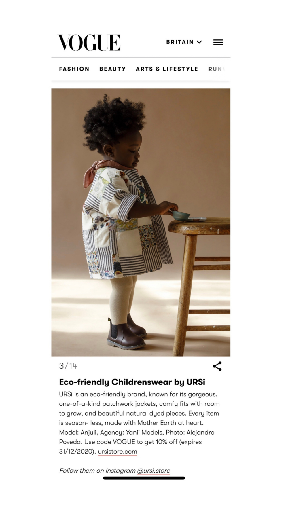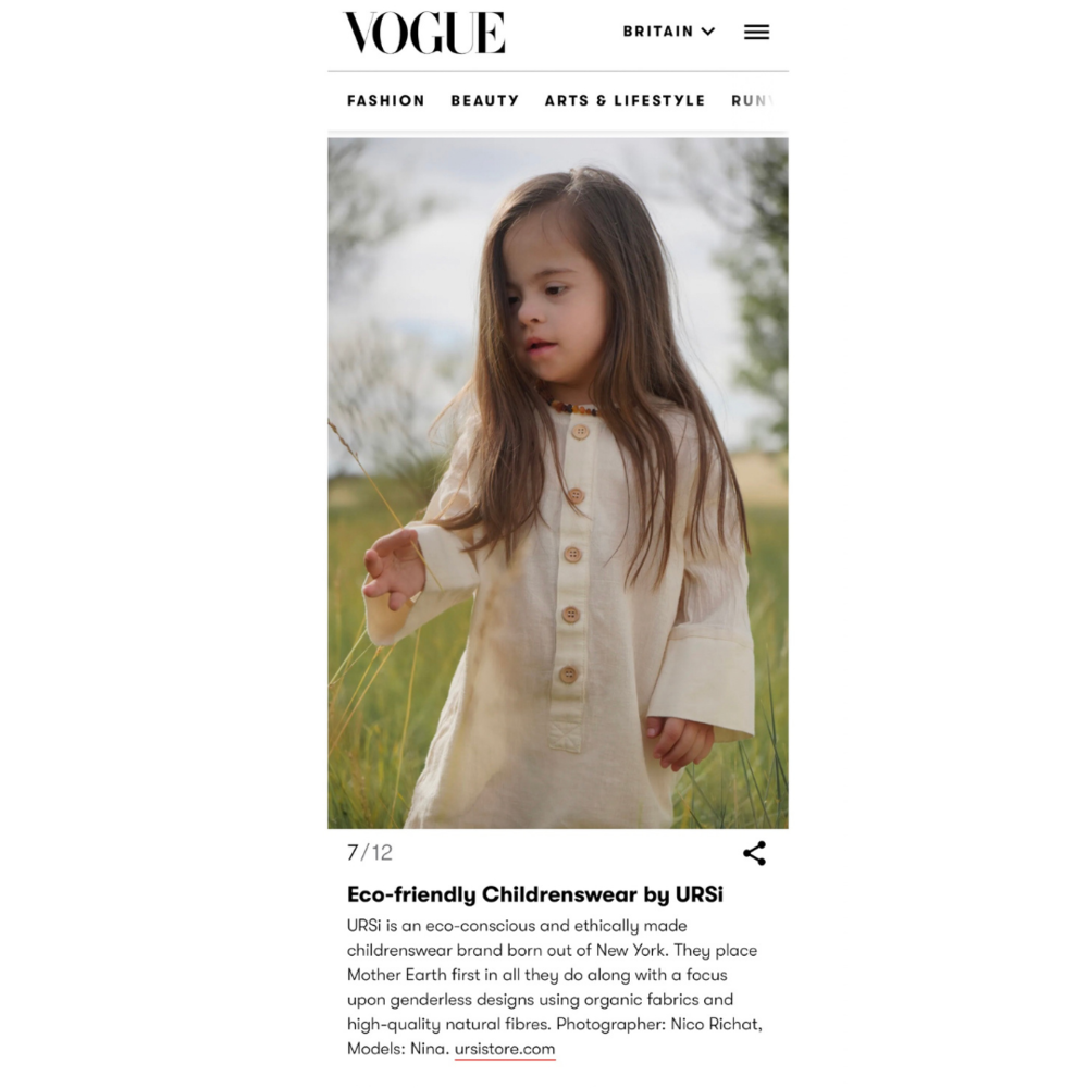 URSi has been featured as one of the up-and-coming eco-friendly brands for kidswear, as seen in VOGUE, TATTLER, Kids BAZAR, AND WGSN
